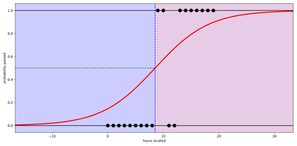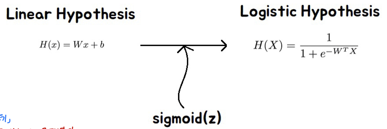 - 선형 회귀의 출력값이 전체의 절반을 넘었으면 그냥 반올림해서 1로, 절반을 못넘겼으면 출력을 0으로 생각해서 분류