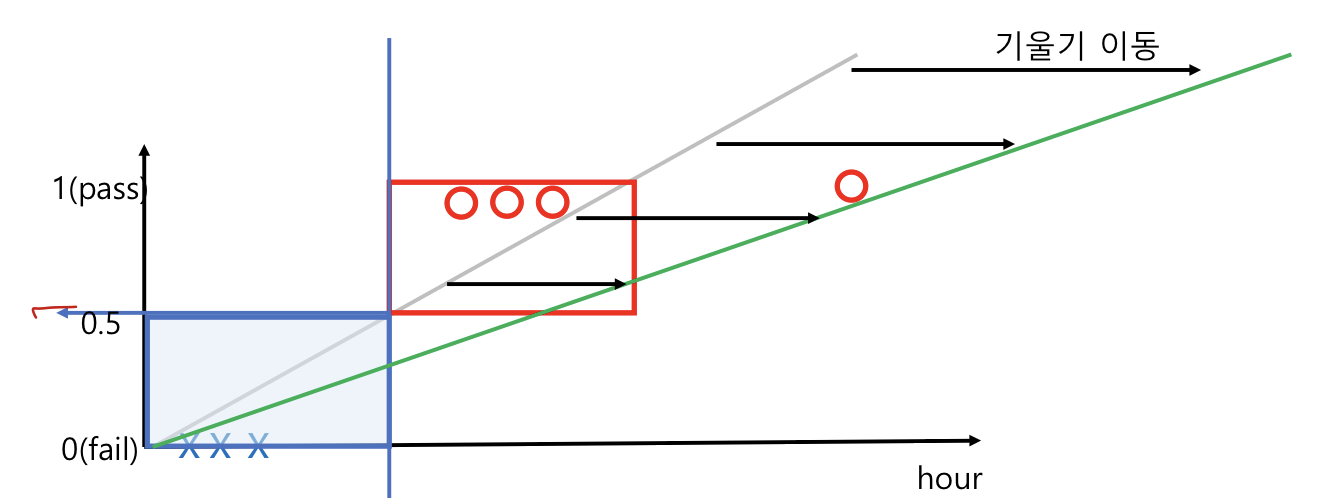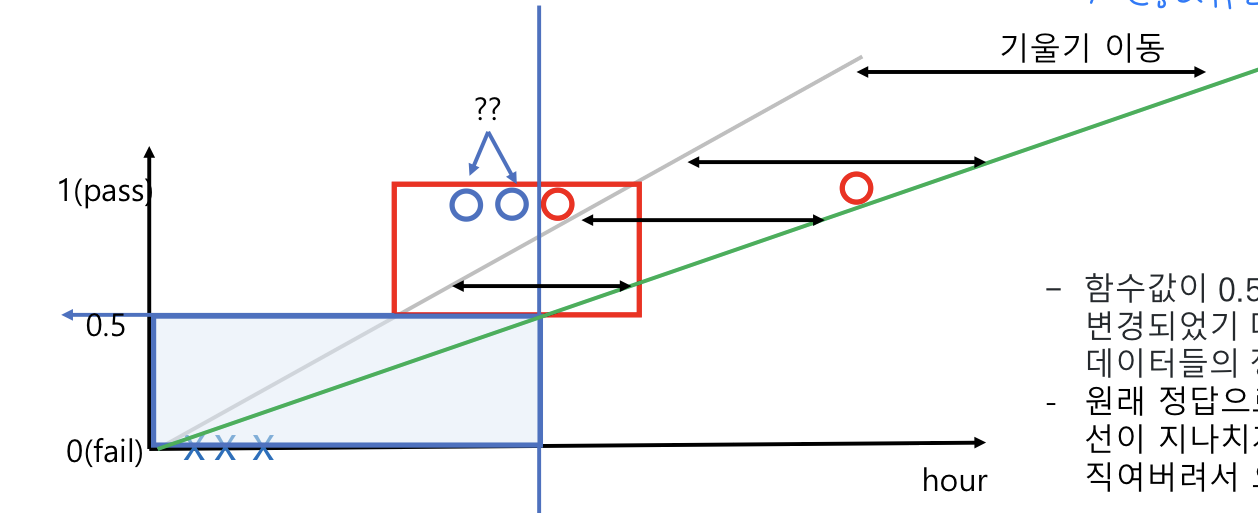 - 기울기가 변하게 되면서 함수의 0.5의 기준이 변화되어 잘못된 분류가 일어나게 됨. --> 선형회귀로 분류시 한계