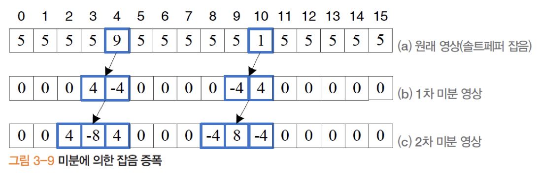 - 특히 2차 미분은 미분을 두 번 수행하므로 잡음 증폭이 더욱 심하다.