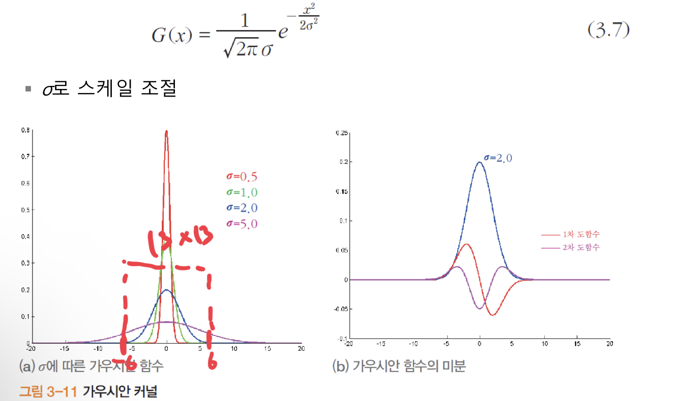 2.가우시안의 매개변수 표준편차를 조절해 다중 스케일(multi- scale) 효과를 얻을 수 있다.