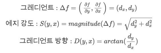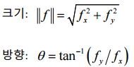 -그레디언트는 벡터값이므로 에지 강도(edge strength)와 에지 방향(edge detection)을 구할 수 있다.