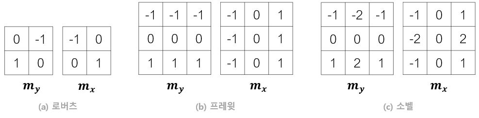 - 아래 그림은 에지 검출에 쓰는 여러가지 마스크이다.