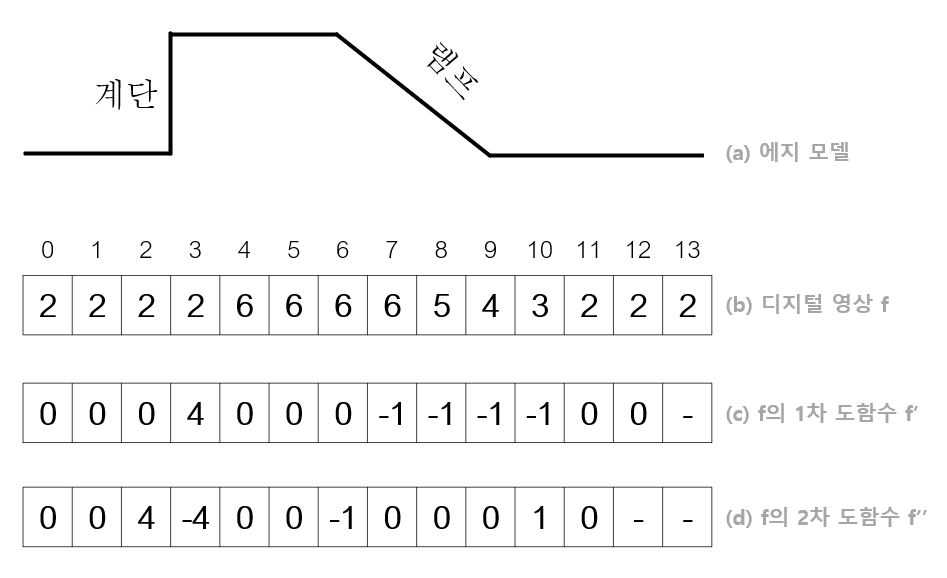 - 이렇게 봉우리와 영교차를 찾는 것이 에지 검출의 기본 원리이다.