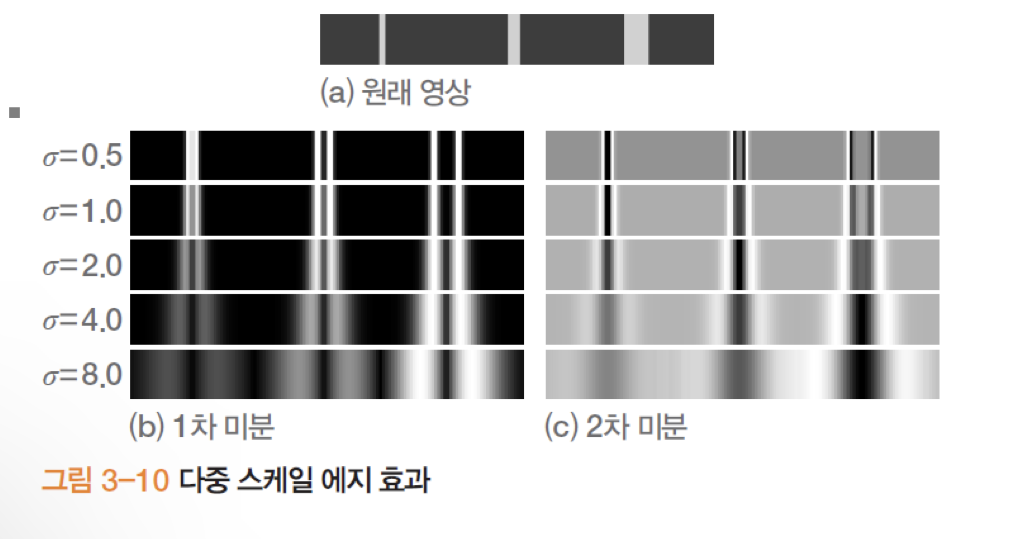 - 결론적으로 가우시안의 표준편차를 조절해 스무딩 정도를 조절할 수있고, 스무딩 정도는 에지 스케일을 정해준다는 것이다.