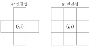 - 보통 동서남북 네 개 화소를 이웃으로 간주하는 4-연결성과, 여덟게 화소를 모두 이웃으로 삼는 8-연결성을 보여 준다.