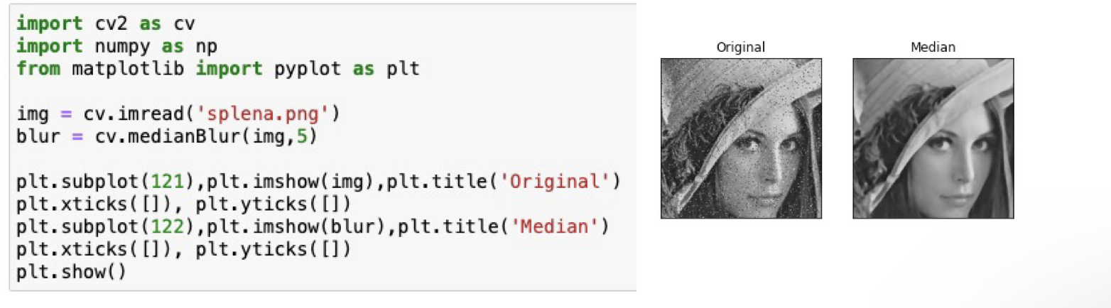 - OpenCV 에서는 미디언 필터링 함수로 cv2.medianBlur 명령어를 제공하고 있다.