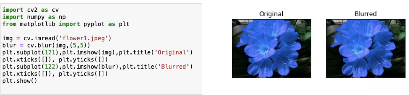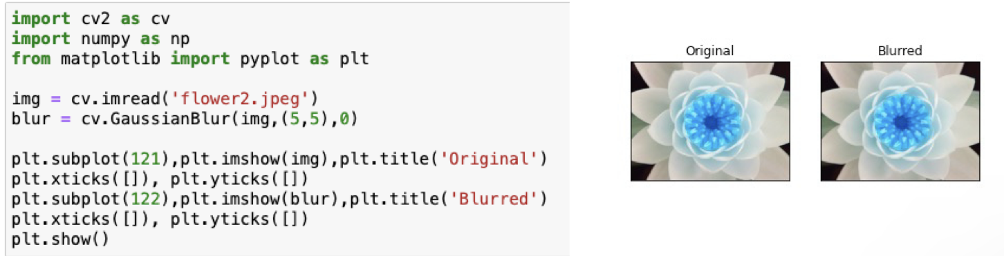 - Image Blurring은 low-pass filter를 이미지에 적용하여 얻을 수 있다.