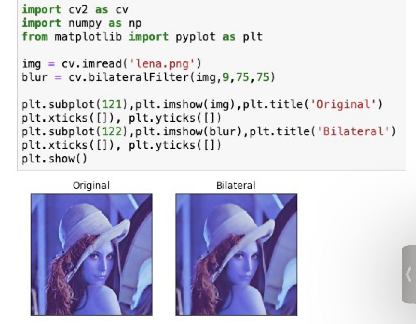 cv2.bilateralFilter(src, d, sigmaColor, sigmaSpace, dst=None, borderType=None) -> dst