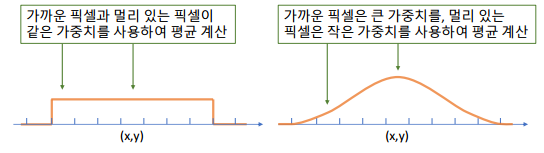 - 평균값 필터 블러링의 단점은 필터링 대상 위치에서 가까이 있는 픽셀과 멀리 있는 픽셀이 모두 같은 가중치를 사용하여 평균을 계산한다.