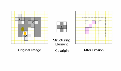 - 각 Pixel에 structuring element를 적용하여 하나라도 0이 있으면 중심 pixel을 제거하는 방법.