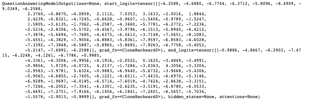 - 이제 모든 토큰에 대한 시작 점수와 끝 점수를 반환하는 모델에 input_ids및 segment_ids를 입력한다.