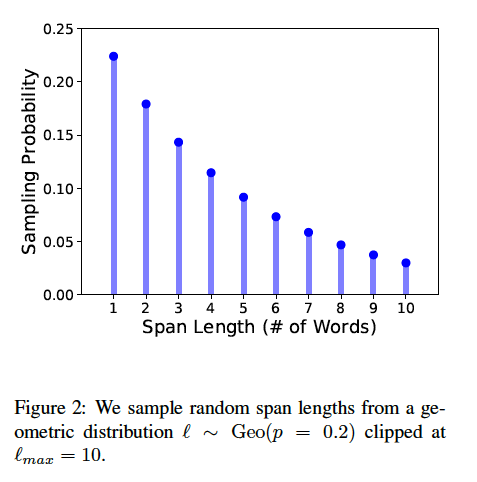 - 이때 span length를 짧은 길이에 편향된 기하 분포(geometric distribution), $l$ ~ $Geo(p)$에서 샘플링한다.