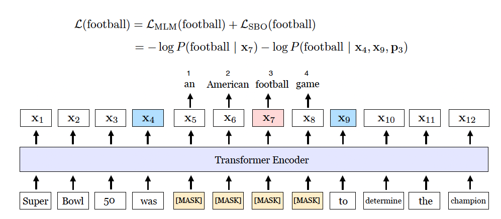 - 토큰을 무작위로 마스킹하는 대신, 연속된 임의의 범위를 마스킹하고, 마스킹 된 전체 내용을 예측하도록 범위 경계 표현을 훈련함으로써 BERT를 확장한다.
