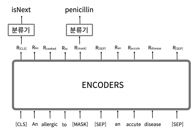 - 위 그림과 같이 마스킹된 단어가 있는 두 문장을 모델에 입력하고,