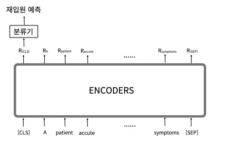 - 다음 그림과 같이 사전 학습된 ClinicalBERT에 임상 메모를 입력하고, 임상 메모의 표현을 반환한다.