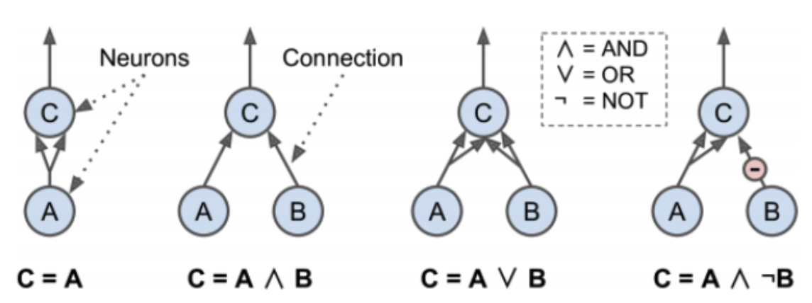 - 네번째 네트워크는 뉴런 B가 켜저있지 않고 A가 켜질 때 활성화 된다. (뉴런 B의 입력이 뉴런 C의 활성화를 억제할 수 있음.)