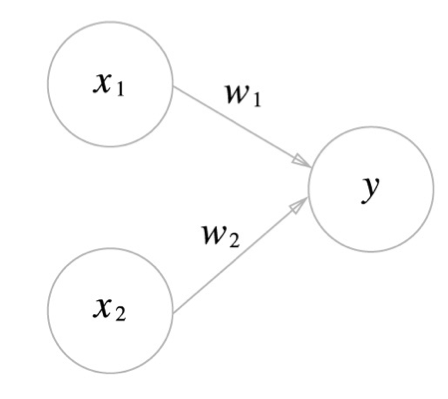 - 입력신호가 y 뉴런에 보내질때 각각 고유한 가중치가 곱해짐 ( w1 * x1 , w2 * x2 )