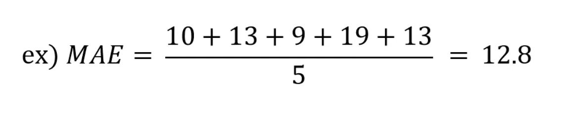 - MAE는 위와 같은 문제를 방지하기 위해 오차에 절댓값을 씌워 계산한 값들의 평균을 구하는 방법이다.