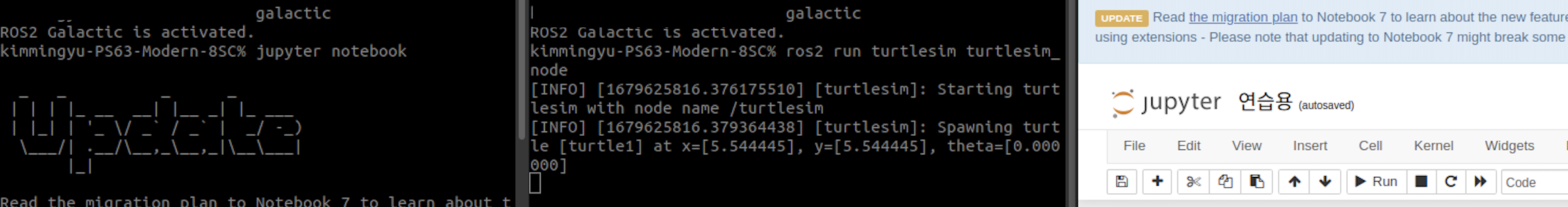 - 터미널을 분할하고 하나에는 주피터 노트북을, 하나는 turtlesim_node를 실행해 준다.