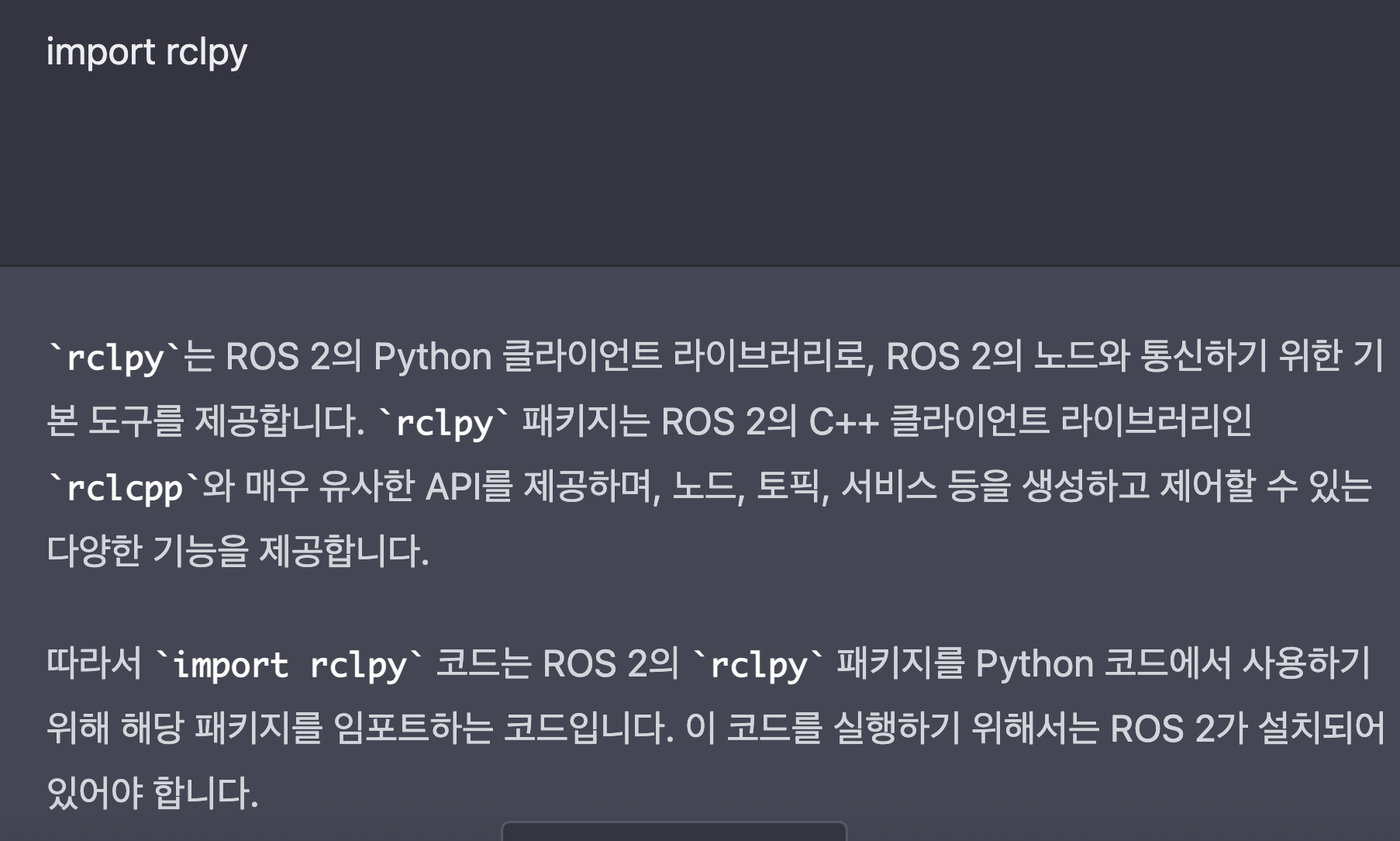 - 다음 명령은 Python에서 rclpy를 초기화하기 위한 코드이다.